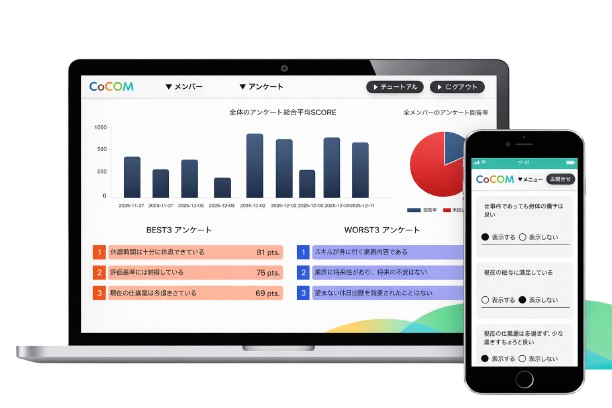 CoCoMは、アンケートを起点にチームワークと働きやすさを同時に高める職場改善プラットフォームです。